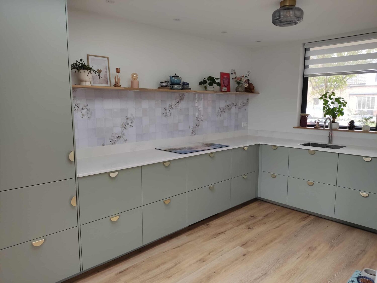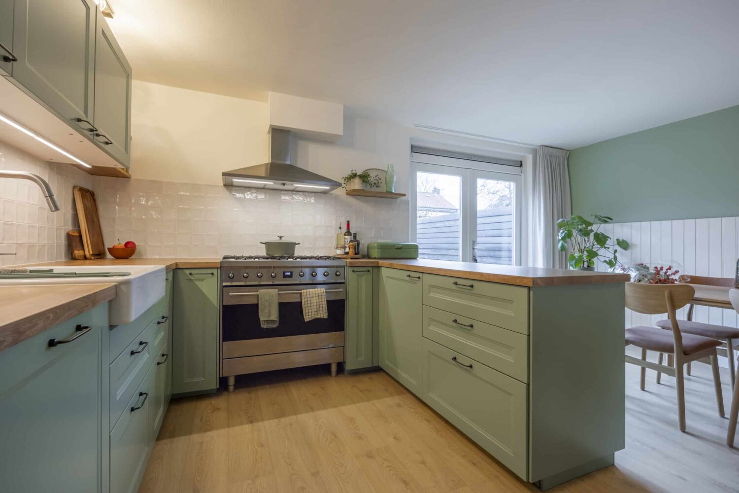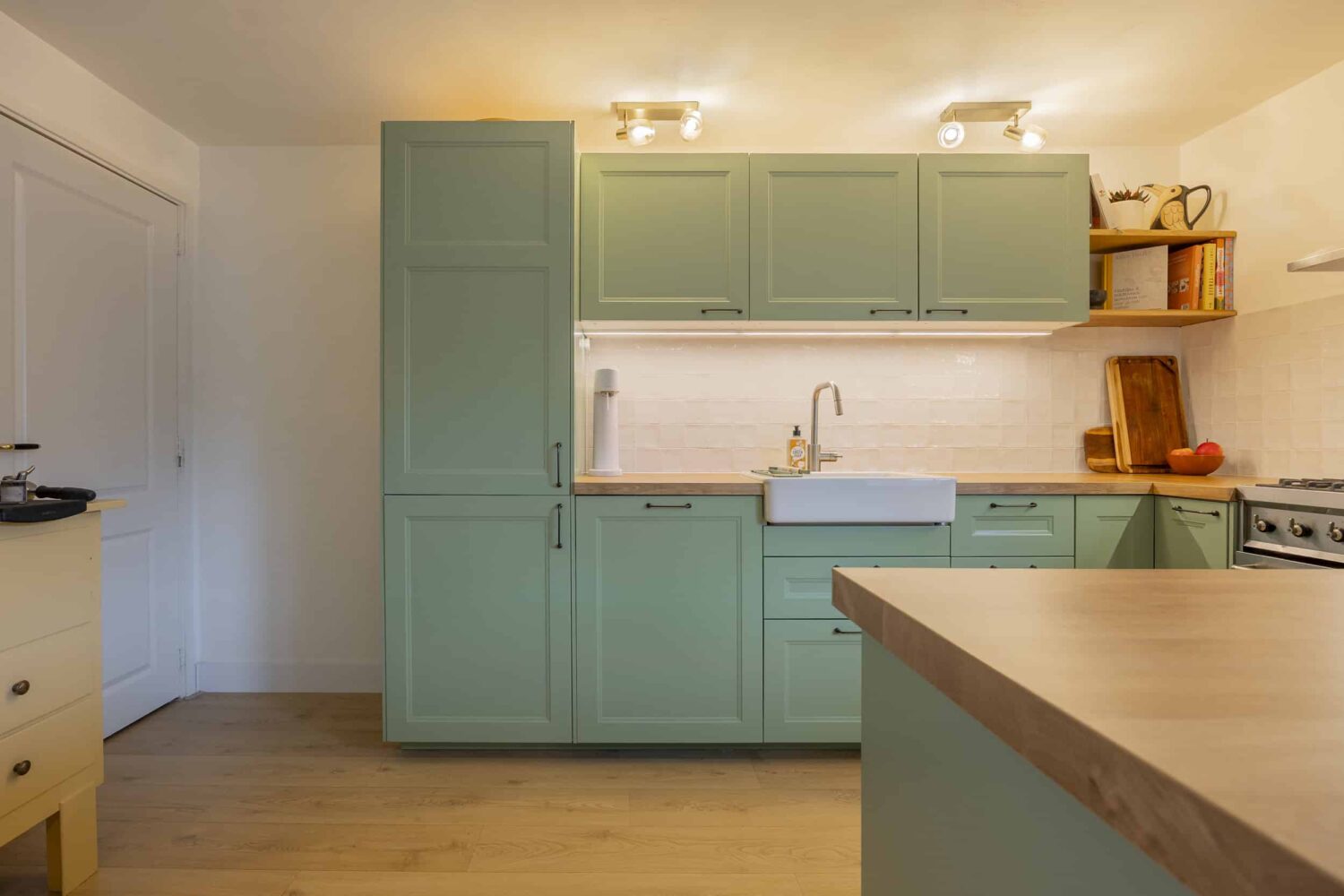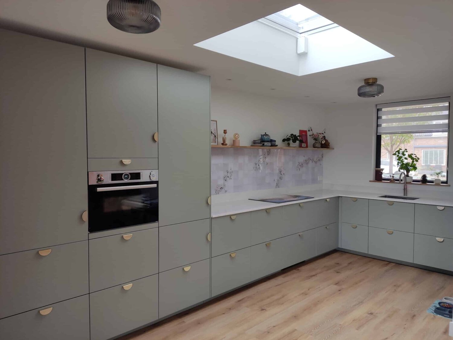 Voor deze IKEA Veddinge keuken zijn de fronten, bedekkingspanelen en plinten professioneel gespoten in Farrow & Ball 25 Pigeon met een matte afwerking. De zachte grijsgroene tint zorgt voor een rustige, tijdloze uitstraling en laat zich mooi combineren met lichte materialen en natuurlijke accenten, maar ook met gouden greepjes.