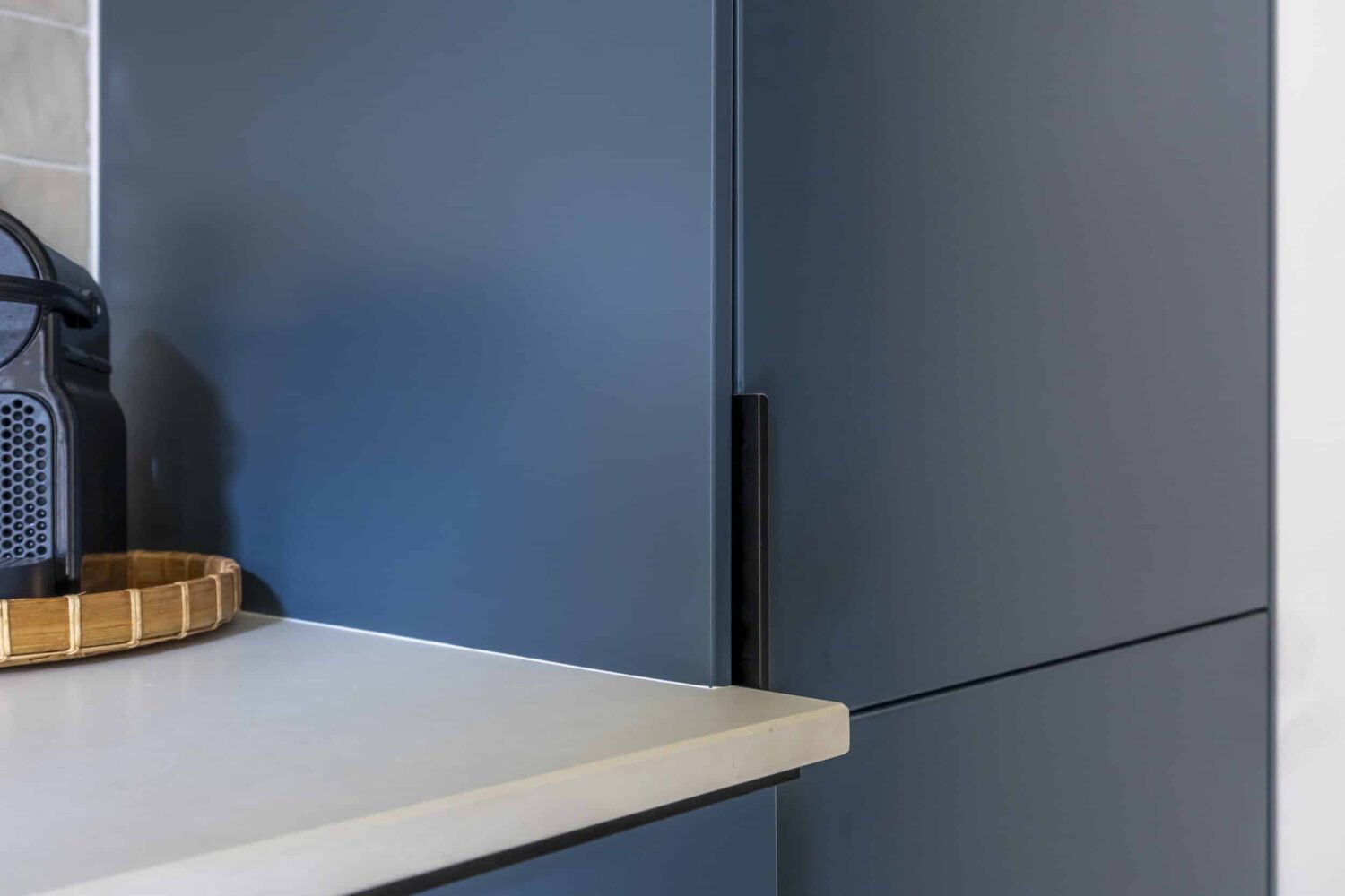 Voor deze IKEA Veddinge keuken zijn de fronten, bedekkingspanelen en plinten professioneel gespoten in NSC S7010-B10G met een matte afwerking. De diepe blauwtint geeft de keuken een moderne en uitgesproken uitstraling.