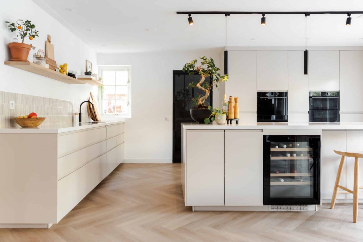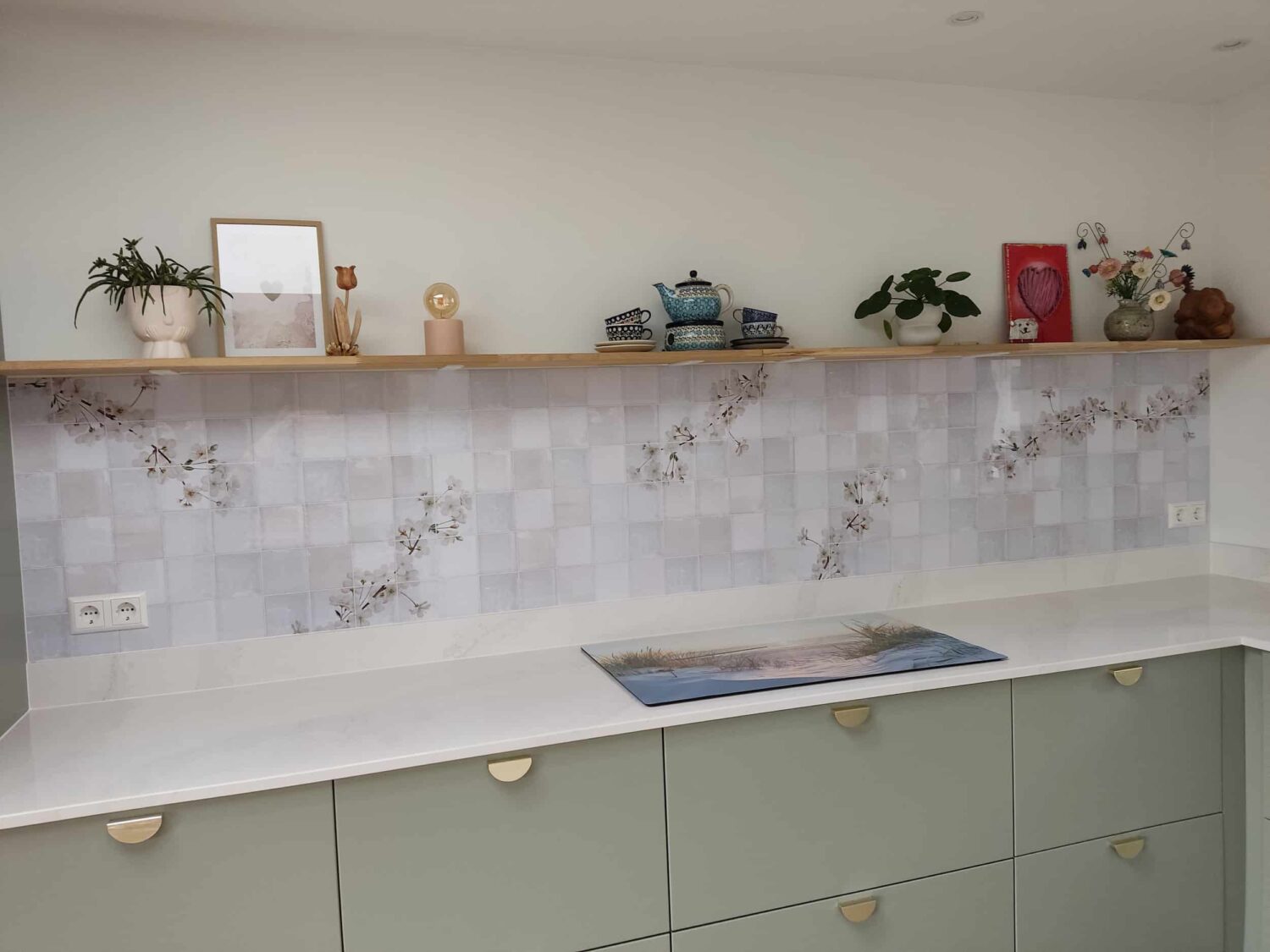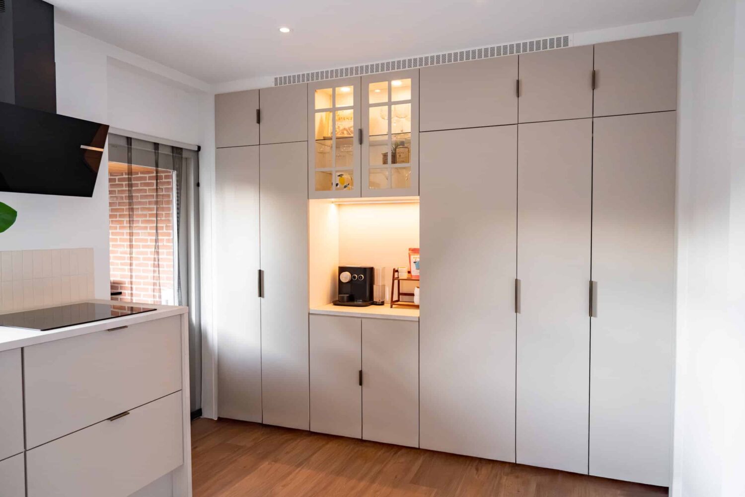 Voor deze IKEA Veddinge keuken zijn de fronten, bedekkingspanelen en plinten professioneel gespoten in Piet Boon Shell met een matte afwerking. Het vitrineglas in de bovenkasten voegt een verfijnd detail toe en versterkt het rustige, maatwerkgevoel van deze keuken.